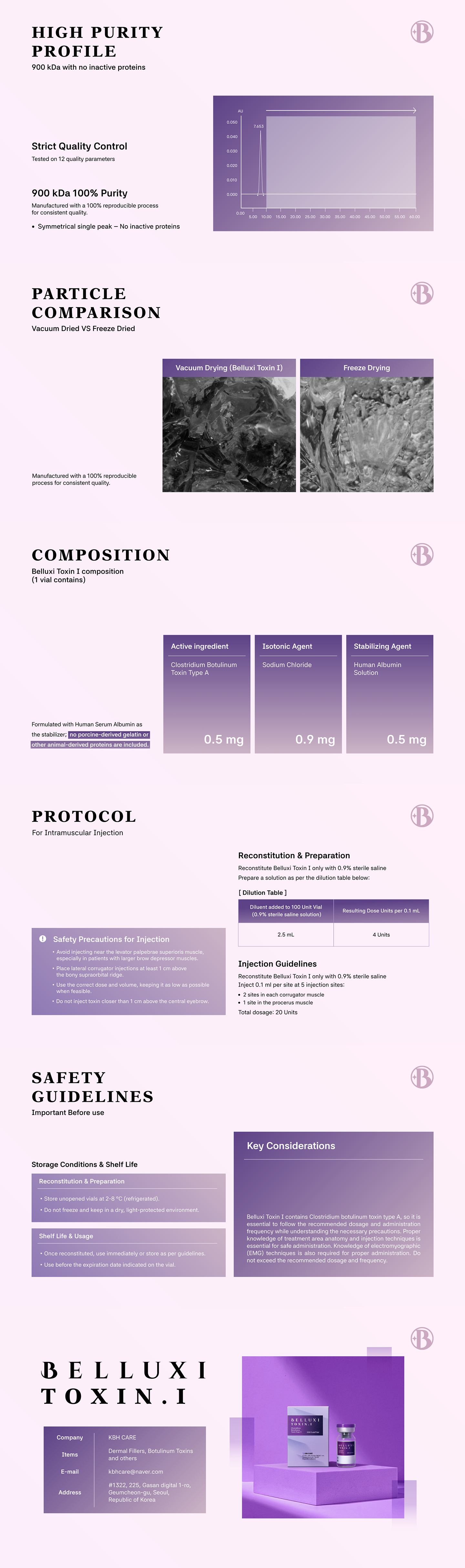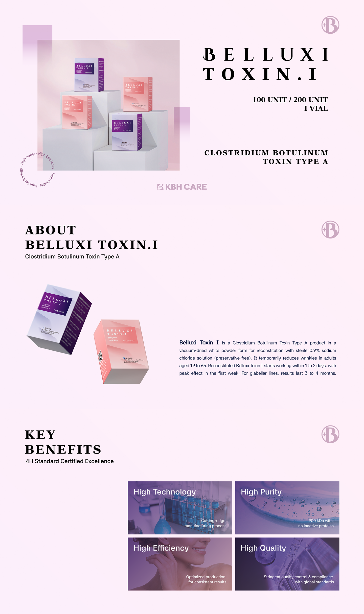 BELLUXI TOXIN. Ⅰ is a vacuum-dried Botulinum Toxin Type A that temporarily reduces wrinkles in adults aged 19-65. Effects begin in 1-2 days, peak in the first week, and for glabellar line, the results last about 3-4 months. This product offers a reliable solution for a smoother, more youthful appearance.